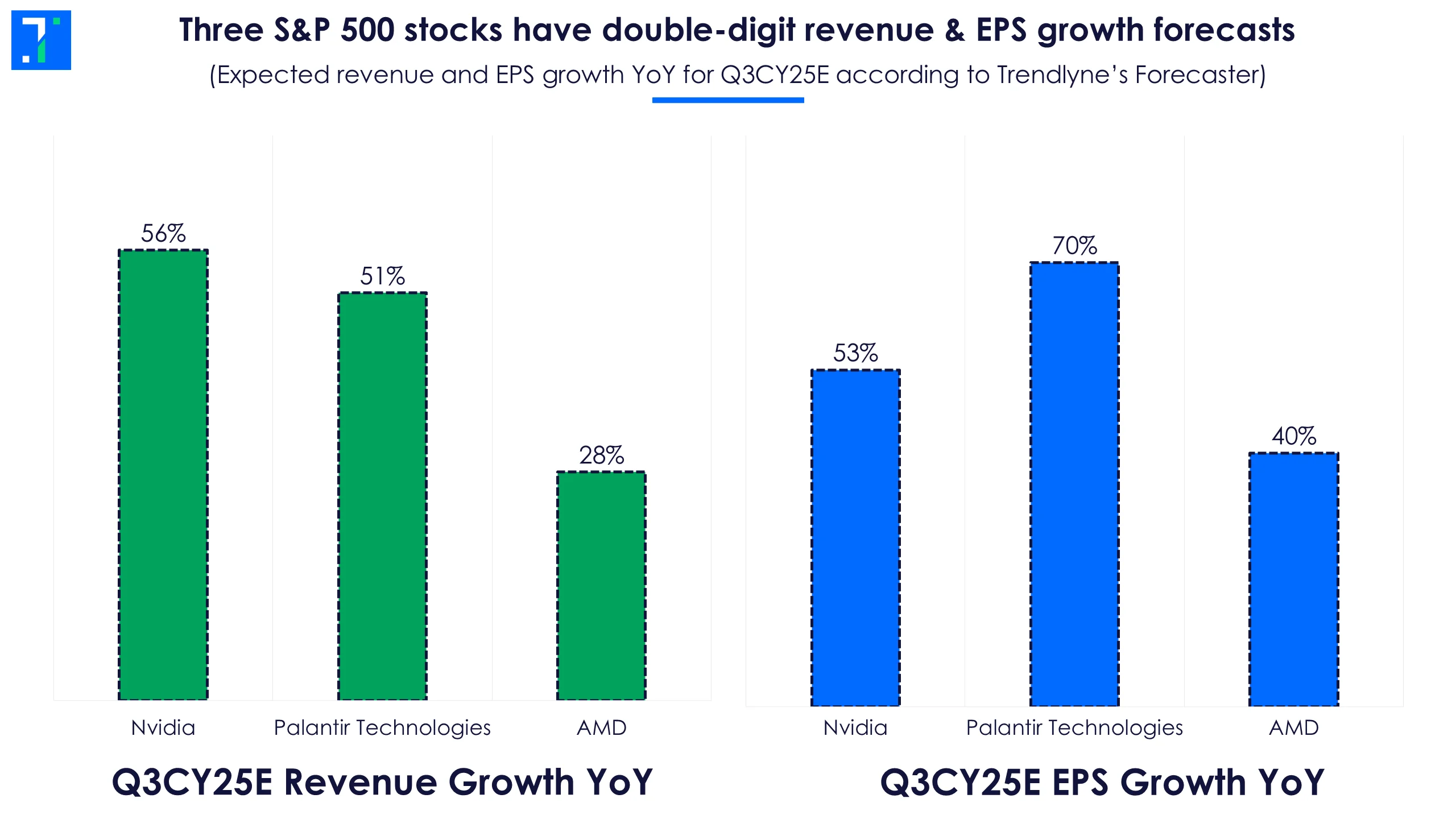 Right now, Nvidia is the market’s sun — when it shines, everything rises. Its immense influence explains why all eyes are on its upcoming results. Analysts forecast Q3 revenue growth of 56% and see EPS up 53% YoY, driven by still-unmatched leadership in GPUs and enterprise AI partnerships.