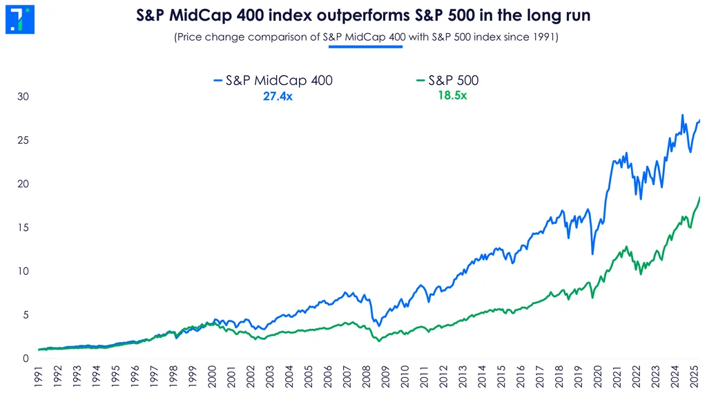 The AI wave isn’t just lifting the giants, it’s boosting midcap stocks too. Over the long term, midcaps have outperformed large caps by a wide margin, and this trend seems set to continue.