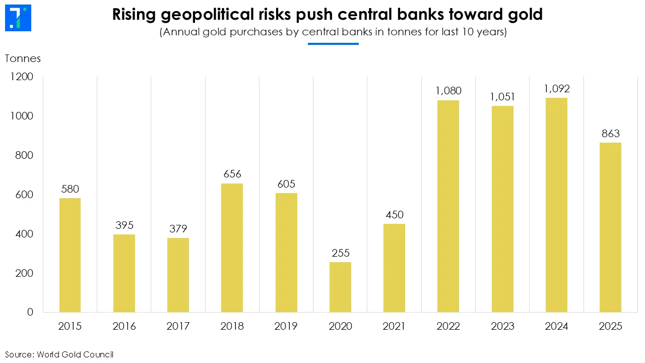 Central banks have been buying accordingly. In 2025 alone, central banks purchased 863 tonnes, well above long-term averages.
